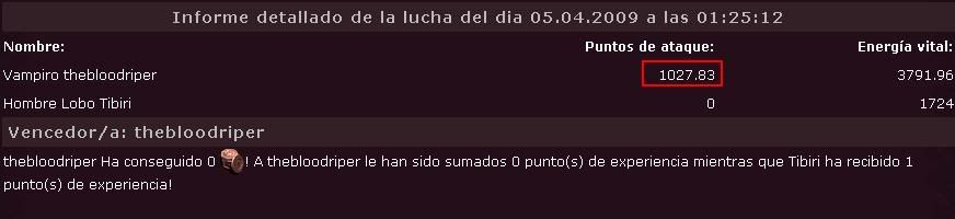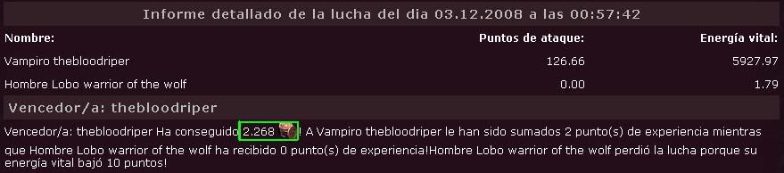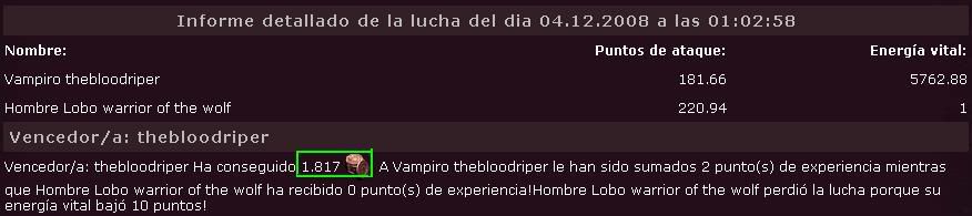 Vencedor/a: thebloodriper Ha conseguido 242 ! A Hombre Lobo FeniXtremE le han sido sumados 0 punto(s) de experiencia mientras que Vampiro thebloodriper ha recibido 2 punto(s) de experiencia! Hombre Lobo FeniXtremE perdió la lucha porque su energía vital bajó 10 puntos!